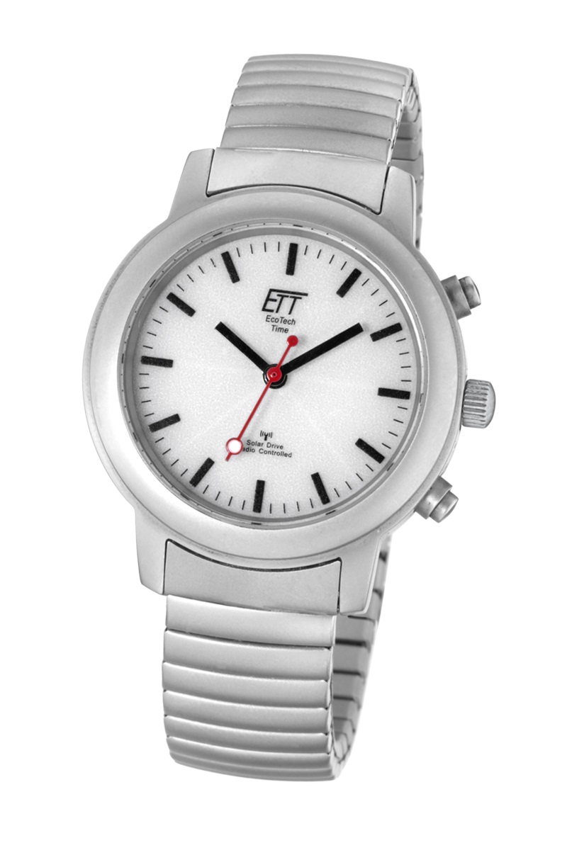 Klassische, schlichte Solar Drive Funk Basic Damenuhr. Das Gehäuse und das Armband der Eco Tech Time Solar Drive Funk Basic Damenuhr sind aus Edelstahl im Titanlook. Das helle Ziffernblatt dieser Damenuhr mit Solartechnik ist durch Mineralglas geschützt. Die Damenuhr ist funkgesteuert mit automatischer Zeiteinstellung.