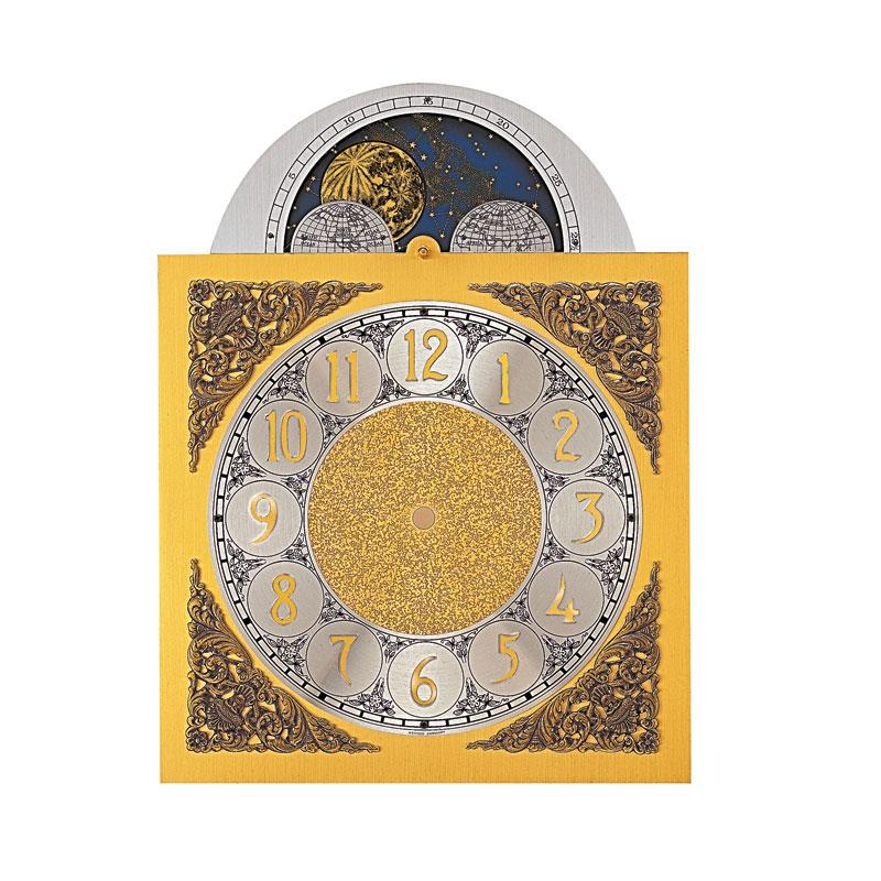 Mit Mondphasenanzeige. Messingfarben eloxiertes, poliertes Aluminiumblatt mit rundgeschliffenem Aluminium-Zahlenreif, aufgelegten Ziffern, granulierter Mittelscheibe sowie antik gefärbten Zierecken. Silberfarbener Mondbogen, nachtblaue Mondscheibe mit goldfarbenem Dekordruck. Komplett mit Blindplatine und Pfeilern passend zu Standuhrwerk FG. Für Zeigerlänge 85-100 mm.