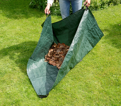 Anschließend wird das Tuch mit Hilfe der Tragegriffe zusammengefaltet und das Schnittgut einfach über dem Kompost entsorgt werden.