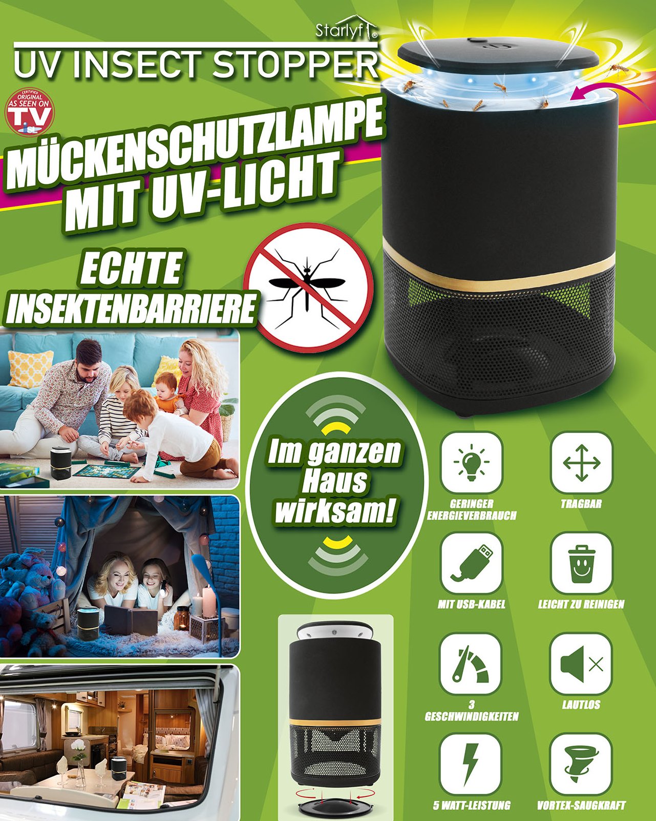 Unsere Mückenschutzlampe mit UV-Licht wirkt im ganzen Haus und ist eine echte Insektenbarriere.
