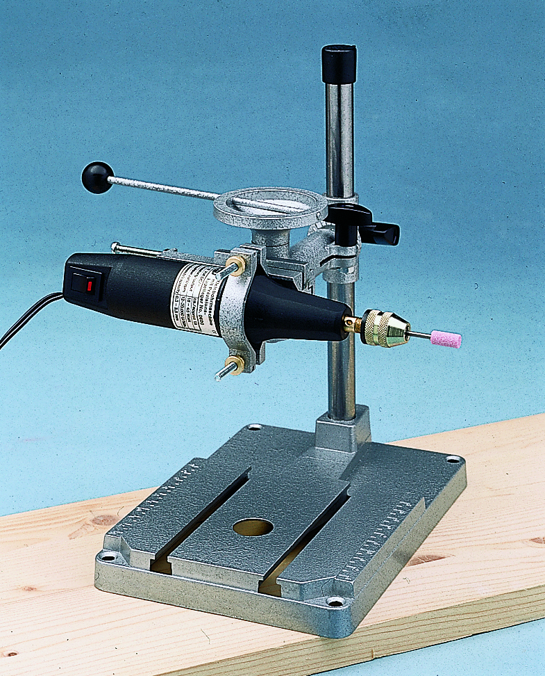 Ganzmetall-Bohrständer für alle Kleinbohrmaschinen, auch Fremdfabrikate. Fester Stand und genauer spielfreier Lauf. Leichte Führung und stufenlos verstellbar in Höhe und Bohrtiefe mit Tiefenanschlag. Die Federkraft für die Rückholfeder an der Hebelachse ist verstellbar. Die Spindel ist um die horizontale und vertikale Achse drehbar, dadurch auch als Schleifböckchen brauchbar. Sockel mit Befestigungsschlitzen für Maschinen-Schraubstock (Anr.: 341330).