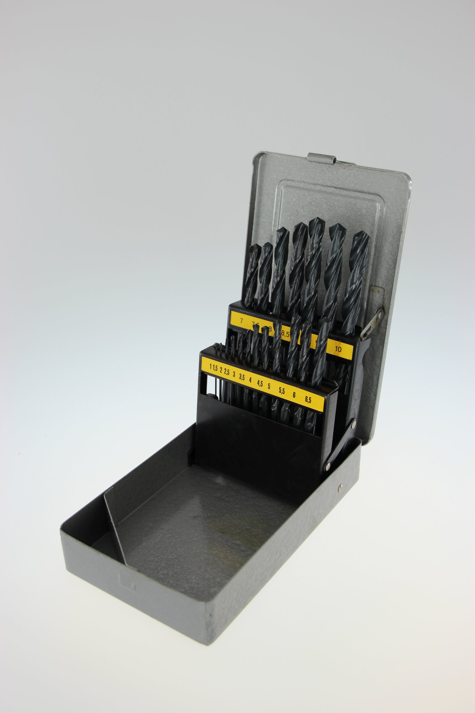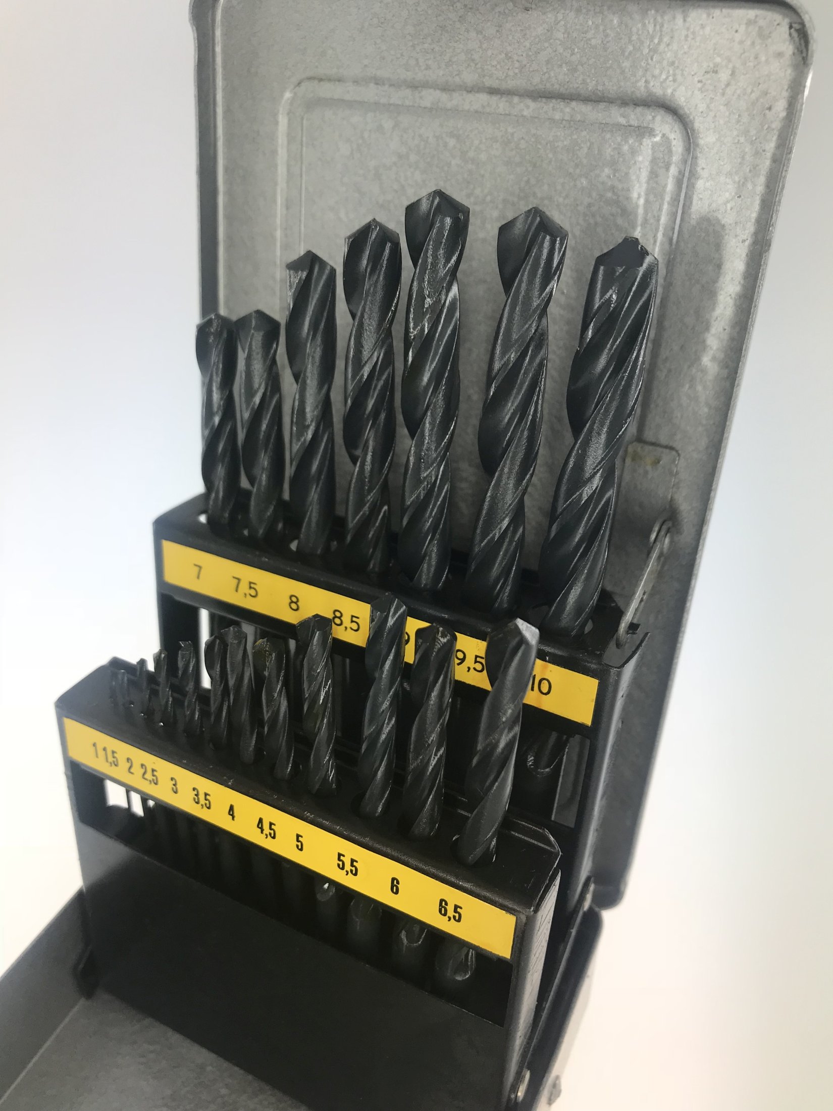 je 1 HSS-Spiralbohrer in den Größen 1,0 - 1,5 - 2,0 - 2,5 - 3,0 - 3,5 - 4,0 - 4,5 - 5,0 - 5,5 - 6,0 - 6,5 - 7,0 - 7,5 - 8,0 - 8,5 - 9,0 - 9,5 und 10,0.