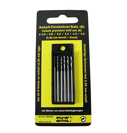 Zum Bohren von besonders harten Stahllegierungen. 10x höhere Standzeit gegenüber HSS-Bohrern, höhere Schnittgeschwindigkeit durch Kreuzanschliff. Je 1x 0,6 - 0,8 - 1,0 - 1,3 - 1,5 und 2,0mm. In Kunststoff-Kassette, Schaft 2,35mm. Perfekt für Metalle (Edelstähle) und harte Kunststoffe.