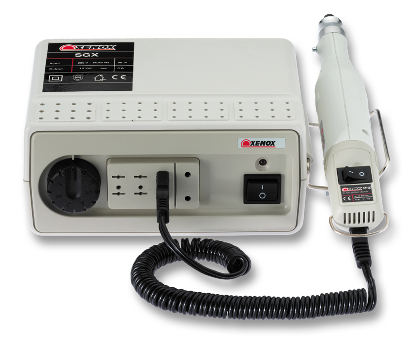 Dieser Motor ist für Arbeiten in Werkstätten mit geringer Motorbelastung und im Hobbybereich geeignet. Elektronische Drehzahlregelung, 3 Anschlussbuchsen für Xenox-Handstücke. Das Gerät besitzt praktische Löcher im Gehäuse zum Einstecken der benötigten Einsatzwerkzeuge mit 2,35- und 3 mm -Schäften.