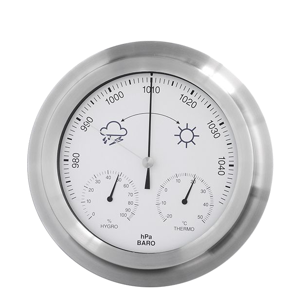 Edle Wetterstation aus Aluminium mit großem Barometer-Display sowie Hygro- und Thermometeranzeigen