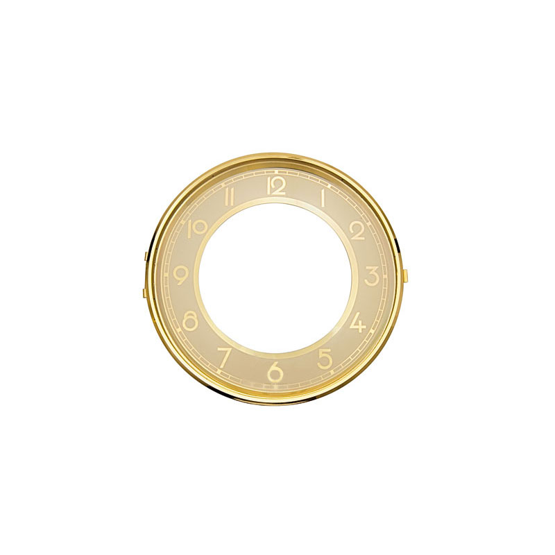 Polished, brass-colored aluminum with printed champagne-colored dial, recessed numerals. Domed hinged glass lid with diamond cut brass ring.