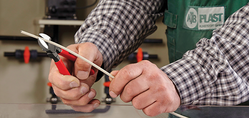 Ein hier verwendeter Seitenschneider darf zum Werkstück hin keine Facette haben, damit dort eine gerade Trennfläche entsteht. Der Knipex-Seitenschneider 364147 wurde speziell für Kunststoffe und weitere weiche Werkstoffe entwickelt. Seine Schneiden sind plangeschliffen.