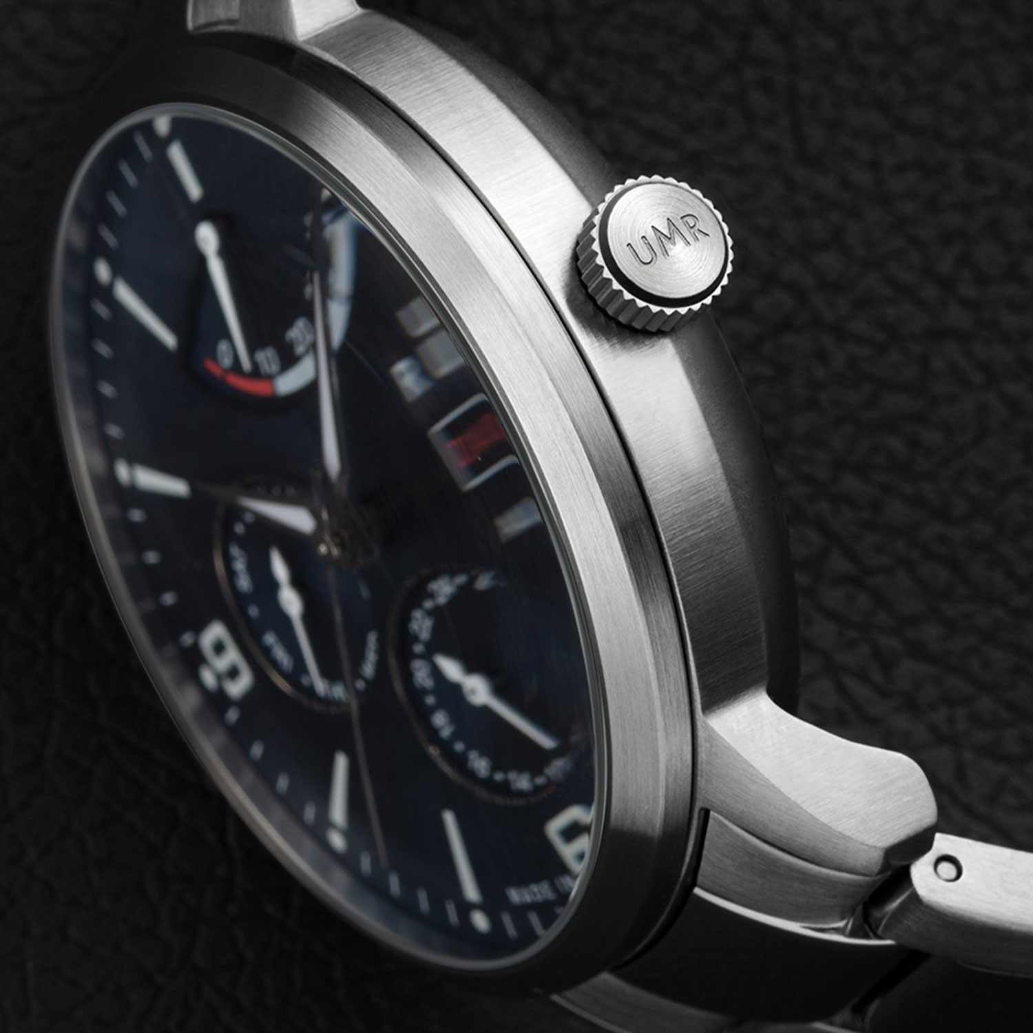 • dunkelblaues Zifferblatt mit weißen Zahlen/Indices