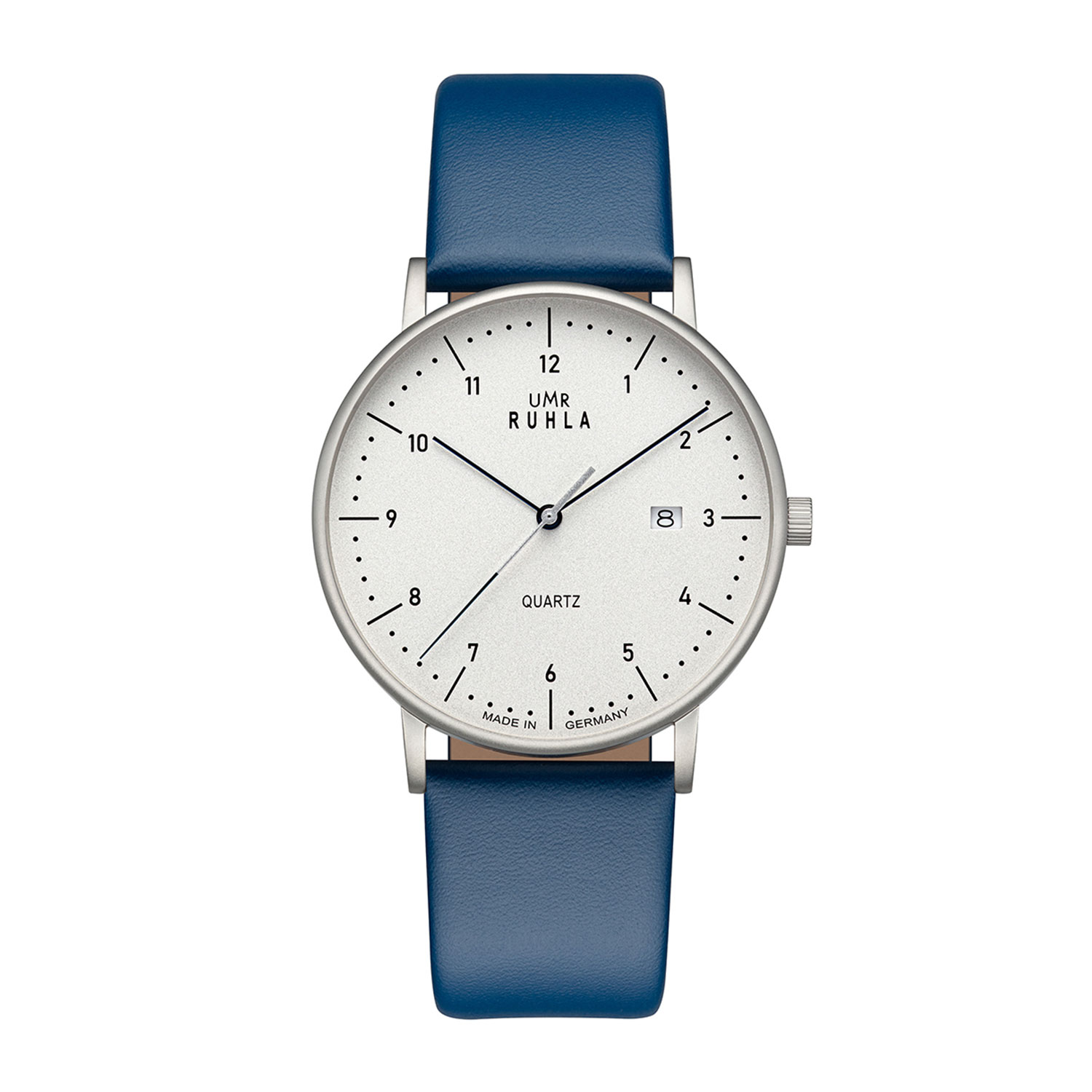 Uhren Manufaktur Ruhla - Armbanduhr Classic - silbernes Geh./weiß, blaues Lederband