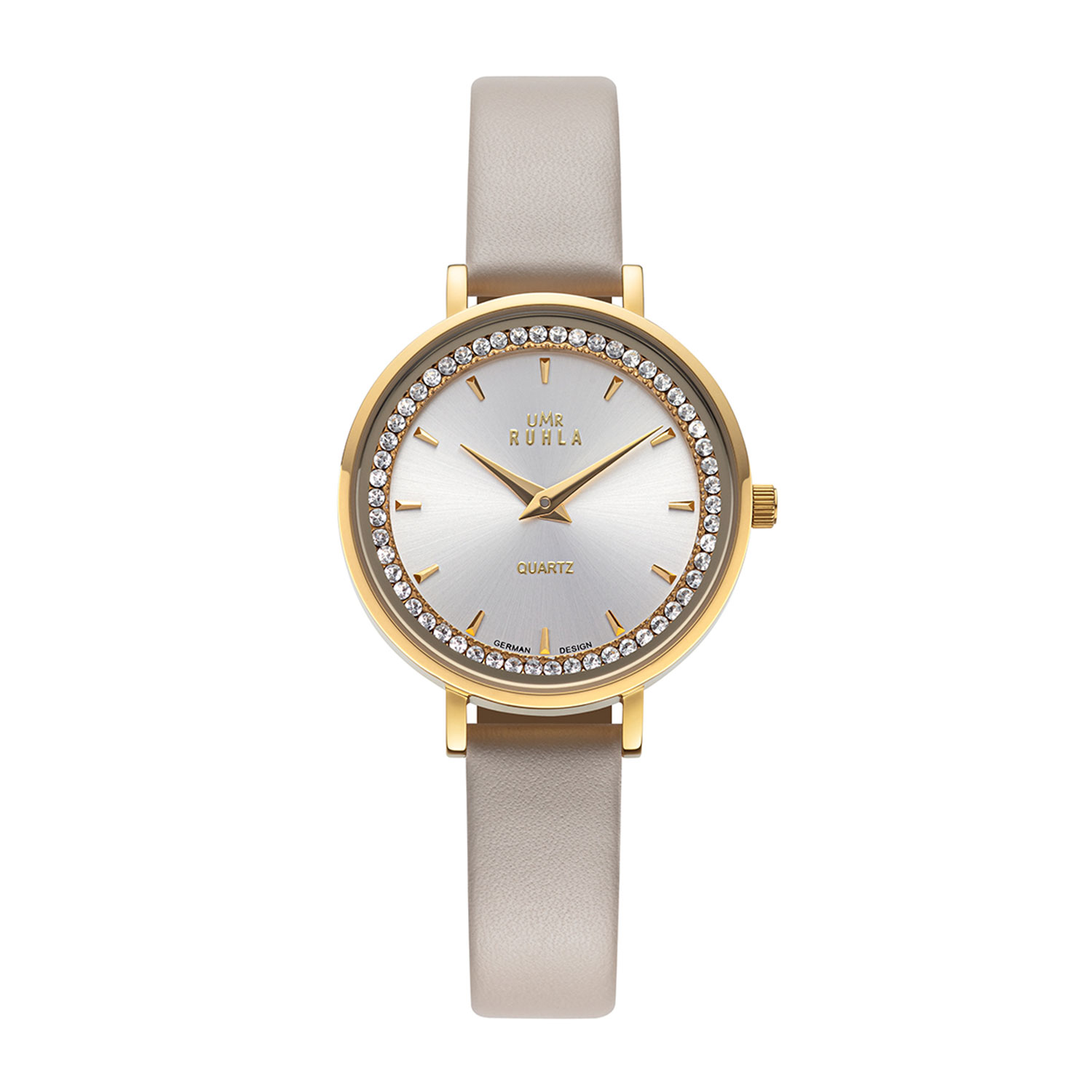 • silbernes Zifferblatt mit goldenen Indizes