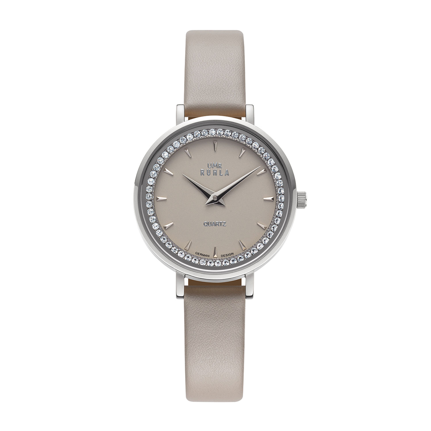 • taupefarbenes Zifferblatt mit silbernen Indizes