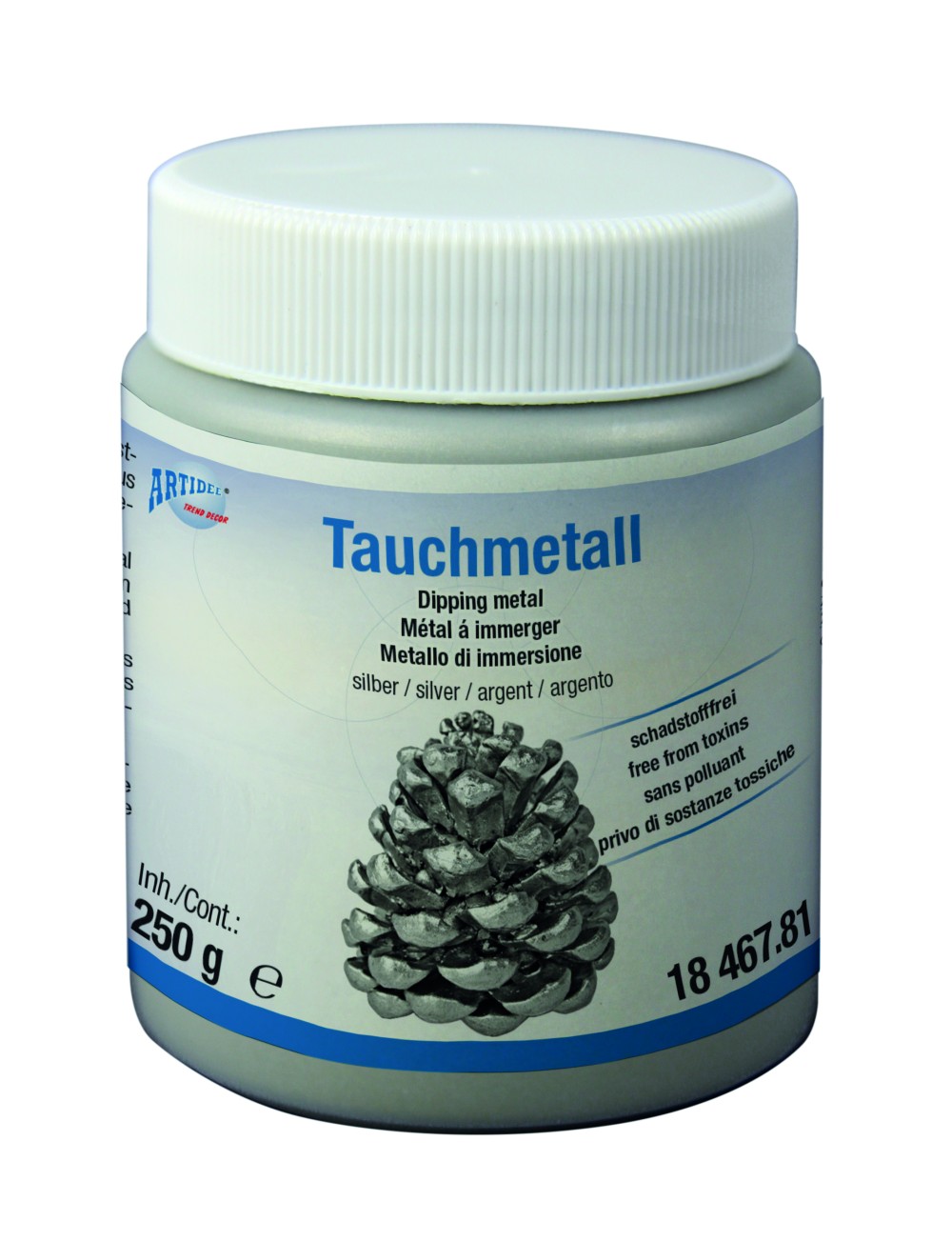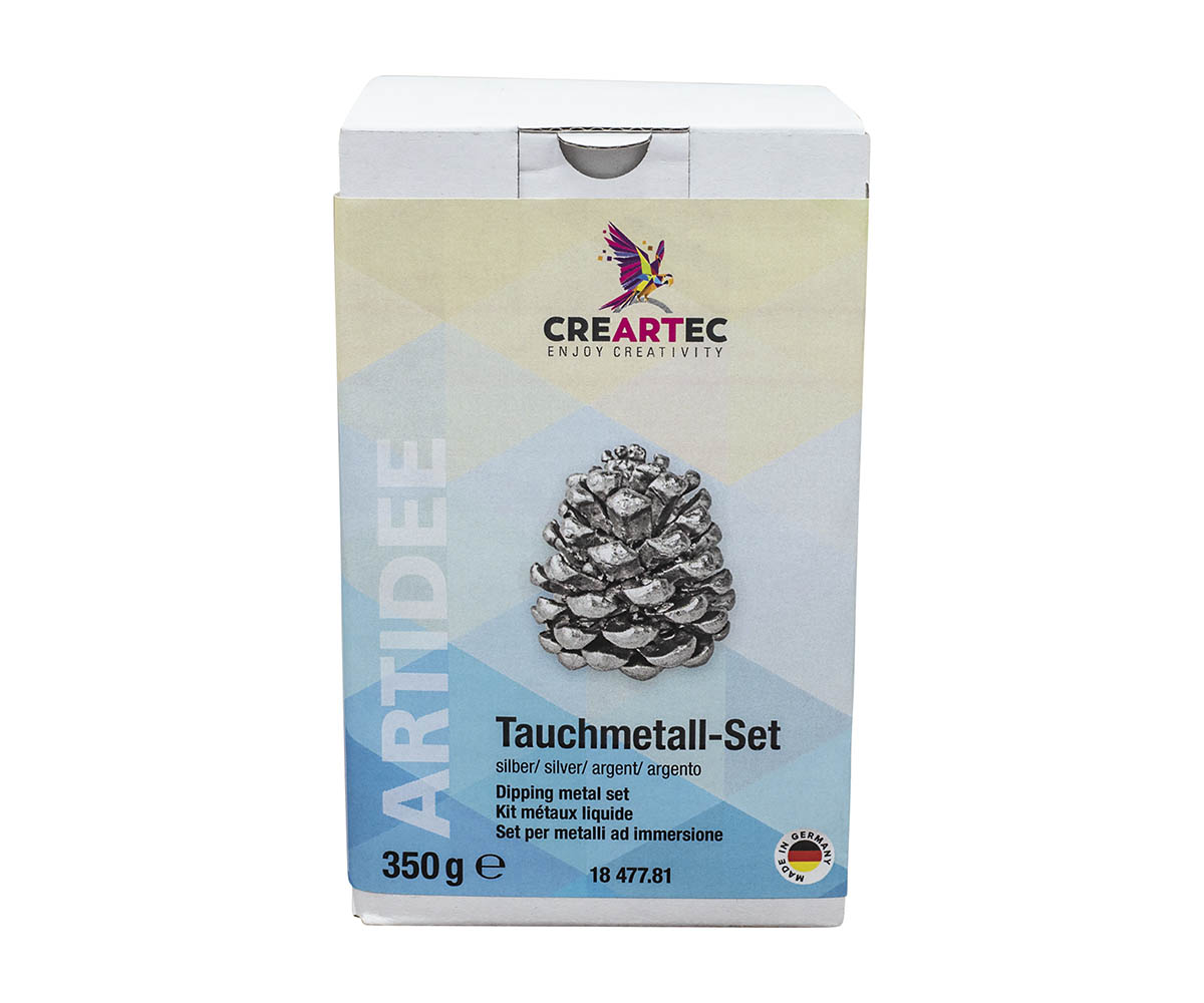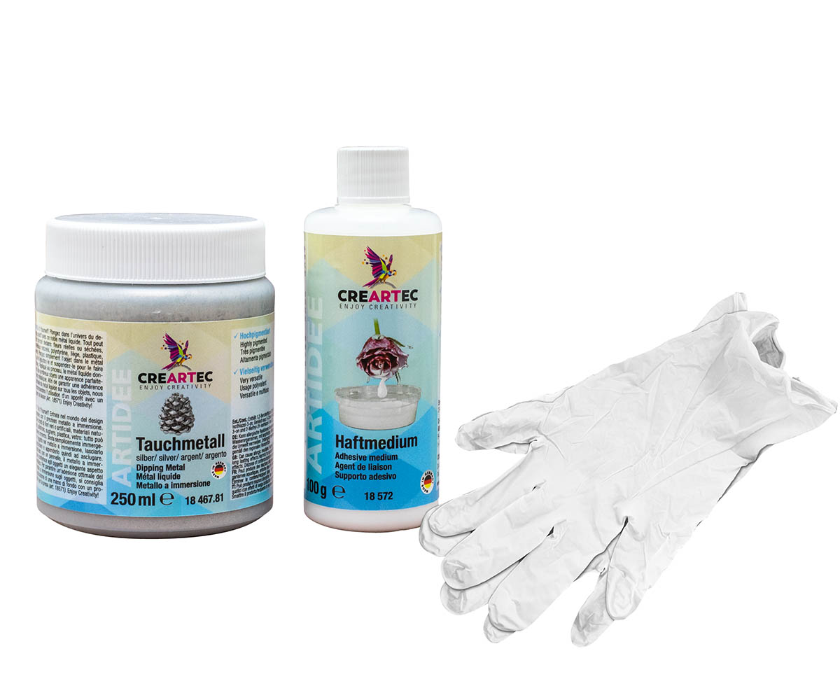 Les objets à métalliser peuvent au préalable être recouverts d’une couche d’accrochage (appelé « Agent de liaison » référence de commande 339942/339943) afin que le métal y adhère parfaitement après le traitement. Les textiles absorbants peuvent au préalable être traités avec un raidisseur de tissu nommé « Stoff-Steif » (référence de commande 339947) et, après séchage et durcissement, être immergés dans le métal à immersion « Tauchmetal ». Le métal à immersion sèche complètement en 40 à 60 minutes et montre immédiatement son bel aspect métallique.