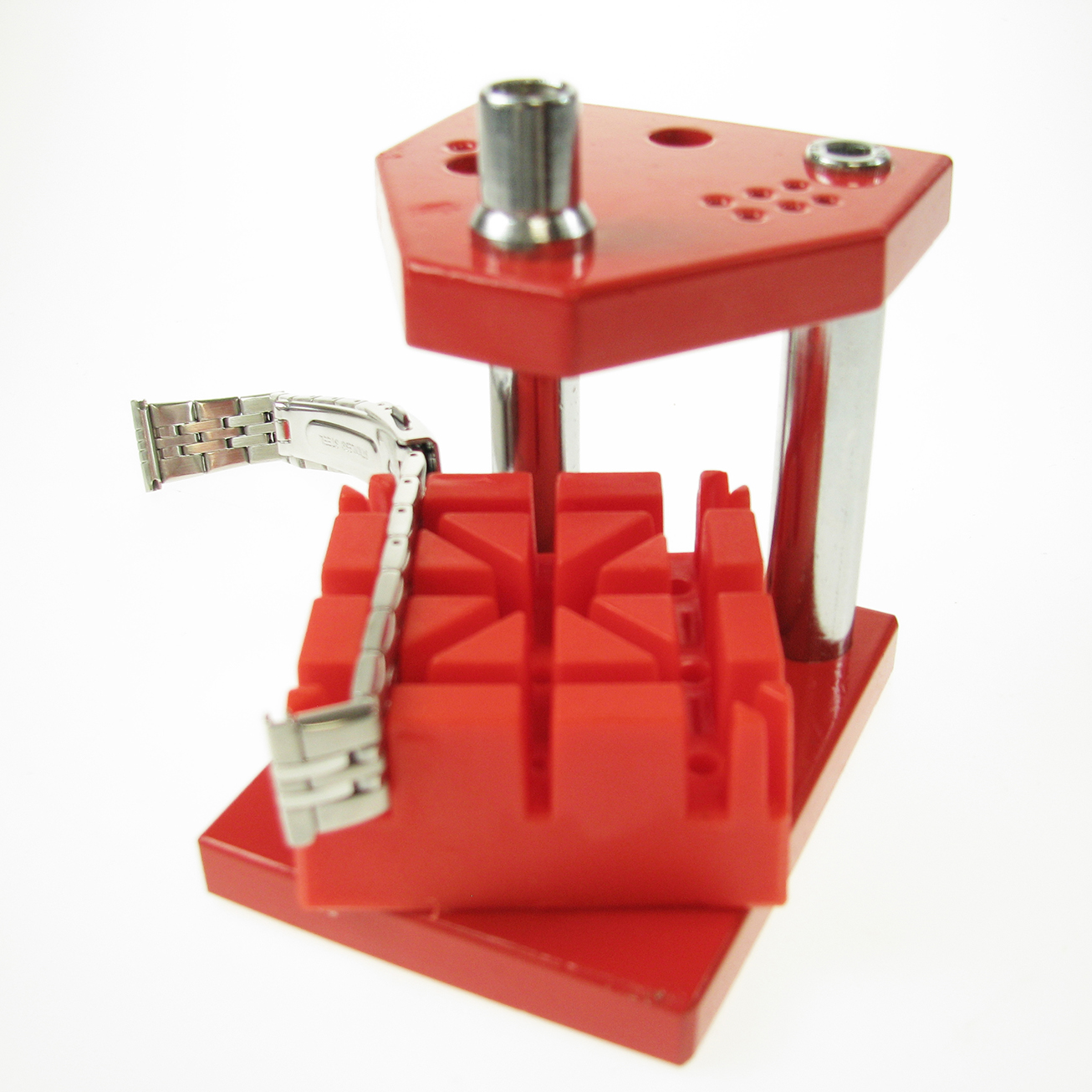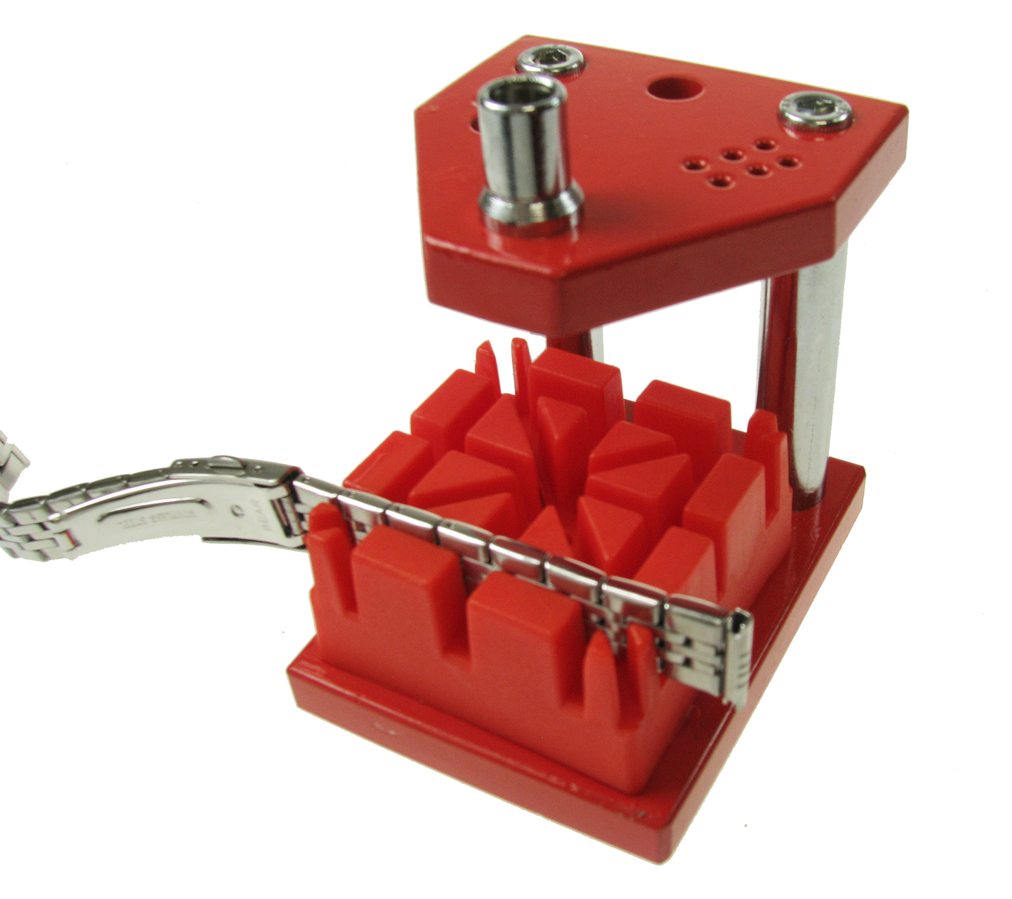 Outil idéal pour retirer et insérer les goupilles pressées ou vissées lors du raccourcissement des bracelets métalliques des montres. Structure métallique solide avec colonnes en acier et support de bracelet fendu en plastique, poinçon avec 6 inserts de Ø 0,4 à 2 mm, tournevis pour goupilles vissées. Bâti : 6,2 x 7,5 x 8 cm.