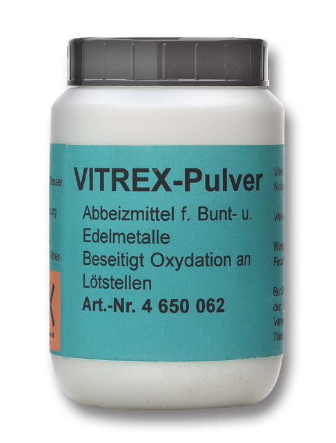 Der besondere Vorteil unseres Vitrex-Pulvers ist die gleichbeibende Aktivität. Es wirkt bis zum letzten Tropfen. Vitrex entfernt bei allen Edelmetallen und Nichteisenmetallen vorhandene Oxyde und Flussmittelreste. Vitrex ist ungeeignet für Eisen.