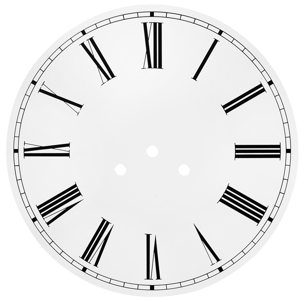 Cadran blanc à 3 trous en aluminium de 1,0 mm. Avec chiffres romains et division des minutes. Diamètre extérieur 260 mm, trous de 10 mm chacun.