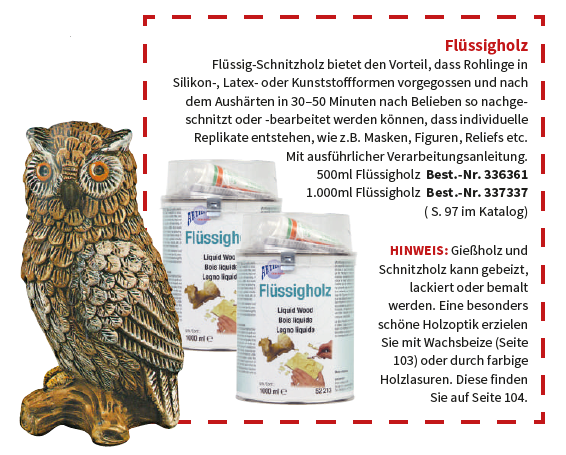 Es zeichnet sich dadurch aus, dass es in flüssiger Konsistenz in jede Form aus Kunststoff, Silikon oder Latex eingefüllt und nach Erhärten mühelos nachgeschnitzt werden kann. Dabei muss keine Rücksicht auf Maserung, Verästelung oder Astlöcher genommen werden, so dass auch Kinder und Jugendliche erste Schnitzversuche wagen können.