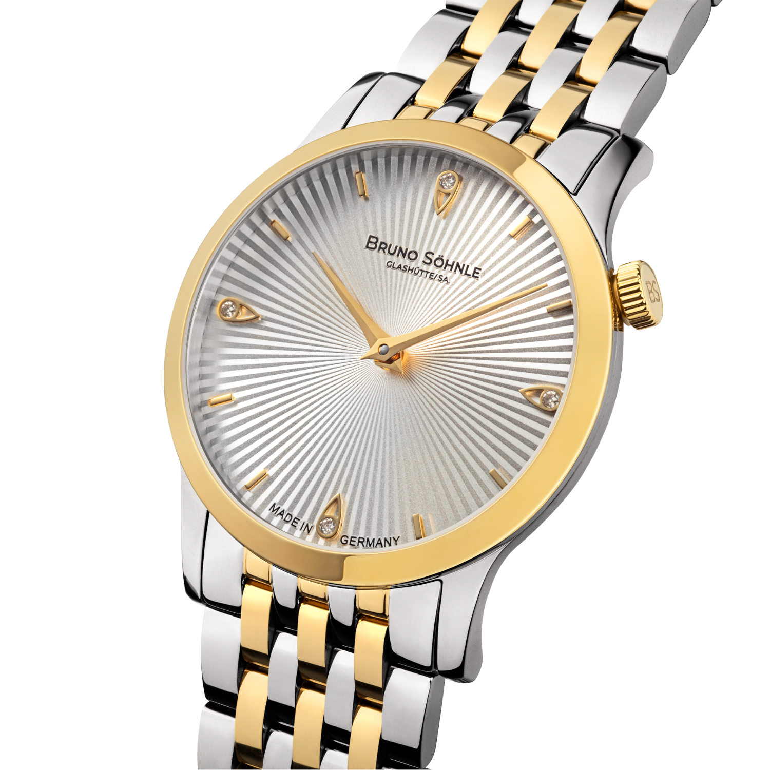 Die Bologna IV in der bicolor-Version kombiniert Edelstahl mit partieller IP-Gold-Beschichtung, was ihr ein modernes und elegantes Aussehen verleiht. Mit einem Gehäusedurchmesser von 28,5 mm und einem silbernen Zifferblatt, das durch einen Wellenschliff und vier brillante Tropfen-Indizes verziert ist, bietet diese Uhr sowohl Stil als auch Funktionalität. Die Krone auf der 2-Uhr-Position bleibt ein hervorstechendes Designelement. Das Edelstahlband sorgt für Tragekomfort, während das Ronda 1062 Uhrwerk, veredelt in Glashütte, präzise Zeitmessung gewährleistet.