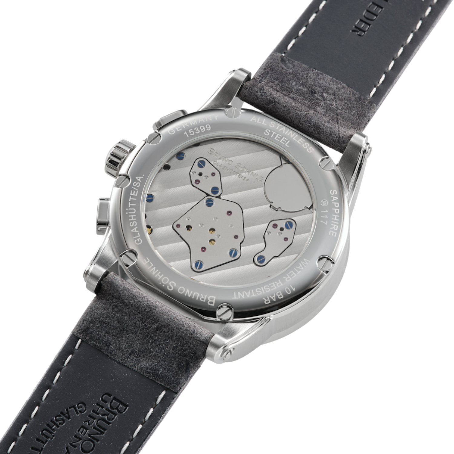Die neue Bruno Söhnle Grandioso bietet, wie für die Modellreihe üblich, sehr viele Funktionen in einer Uhr. Da wäre das Großdatum auf 6 Uhr, die Tagesanzeige auf 12 Uhr und natürlich die Chronographenfunktion selbst. Das verzierte Zifferblatt in gedecktem Grauton spielt geradezu mit dem Licht und passt hervorragend zu dem grauen Lederarmband.