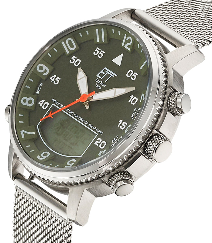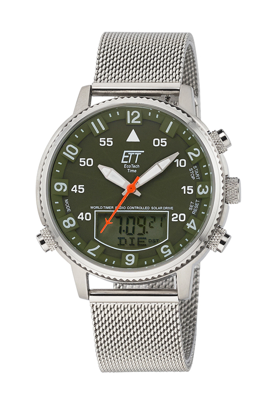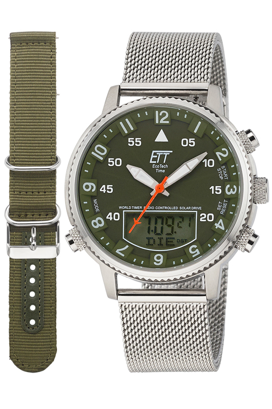 Die ETT Professional Adventure Solar Drive, eine funkgesteuerte Herrenuhr, besitzt ein sportliches Design. Sie ist ausgestattet mit einem Edelstahl-Meshband und einem dunkelgrünen Wechselband aus Nylon, das leicht und ohne Werkzeug gewechselt werden kann. Die Professional-Uhr hat viele Funktionen wie World Timer für 37 internationale Städte, Stoppuhr, Datums- und Tagesanzeige und einen ewigen Kalender. Das Gehäuse und Band sind aus robustem Edelstahl gefertigt, wasserdicht ist die Uhr bis zu 10 Bar. Dank des Solarantriebes (aus Licht wird Energie) ist die Adventure-Uhr sehr Umweltfreundlich. NIE MEHR BATTERIEWECHSEL.