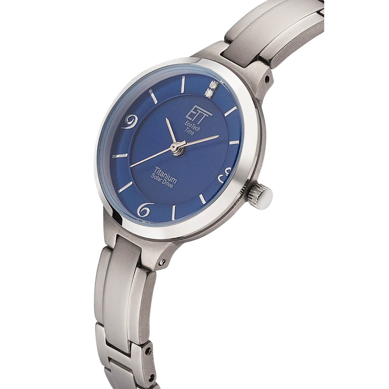 Auf dem blauen Zifferblatt dieser Solaruhr für Damen befinden sich zwei echte, funkelnde Diamanten. Das Gehäuse und das Armband der Damenuhr bestehen aus Titan. Wasserdicht ist diese Uhr bis 5 Bar.