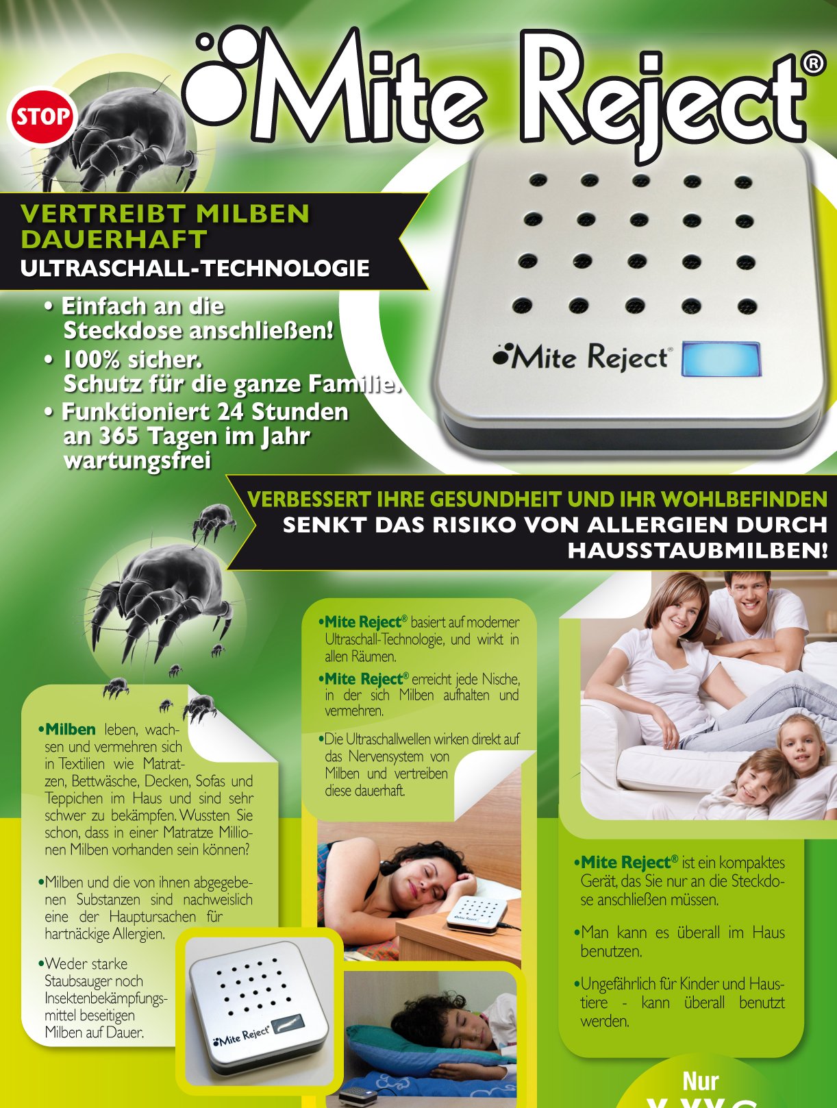 Was weder starke Staubsauger noch herkömmliche Insektenbekämpfungsmittel schaffen, schafft Mite Reject dank moderner Ultraschall-Technologie: Es vertreibt Milben dauerhaft und erreicht dabei jede kleinste Nische, in der sich die Plagegeister aufhalten und vermehren.