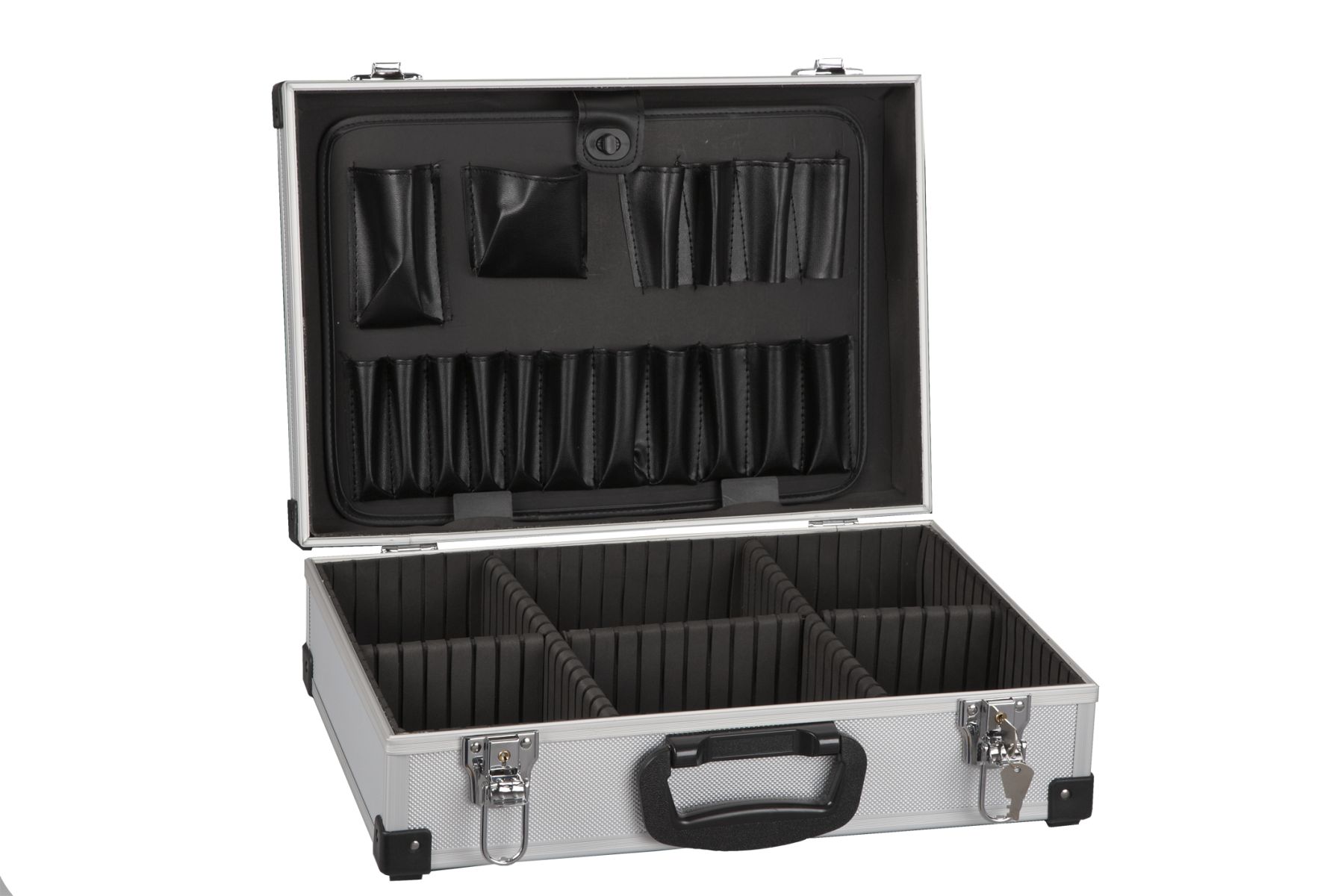 Robuster Rahmenkoffer aus festem Alu mit 6 variablen Facheinteilungen und herausnehmbaren Werkzeugeinlagen. Außenmaße: 430 x 315 x 140mm, Innenmaße: 410 x 280 x 120mm.