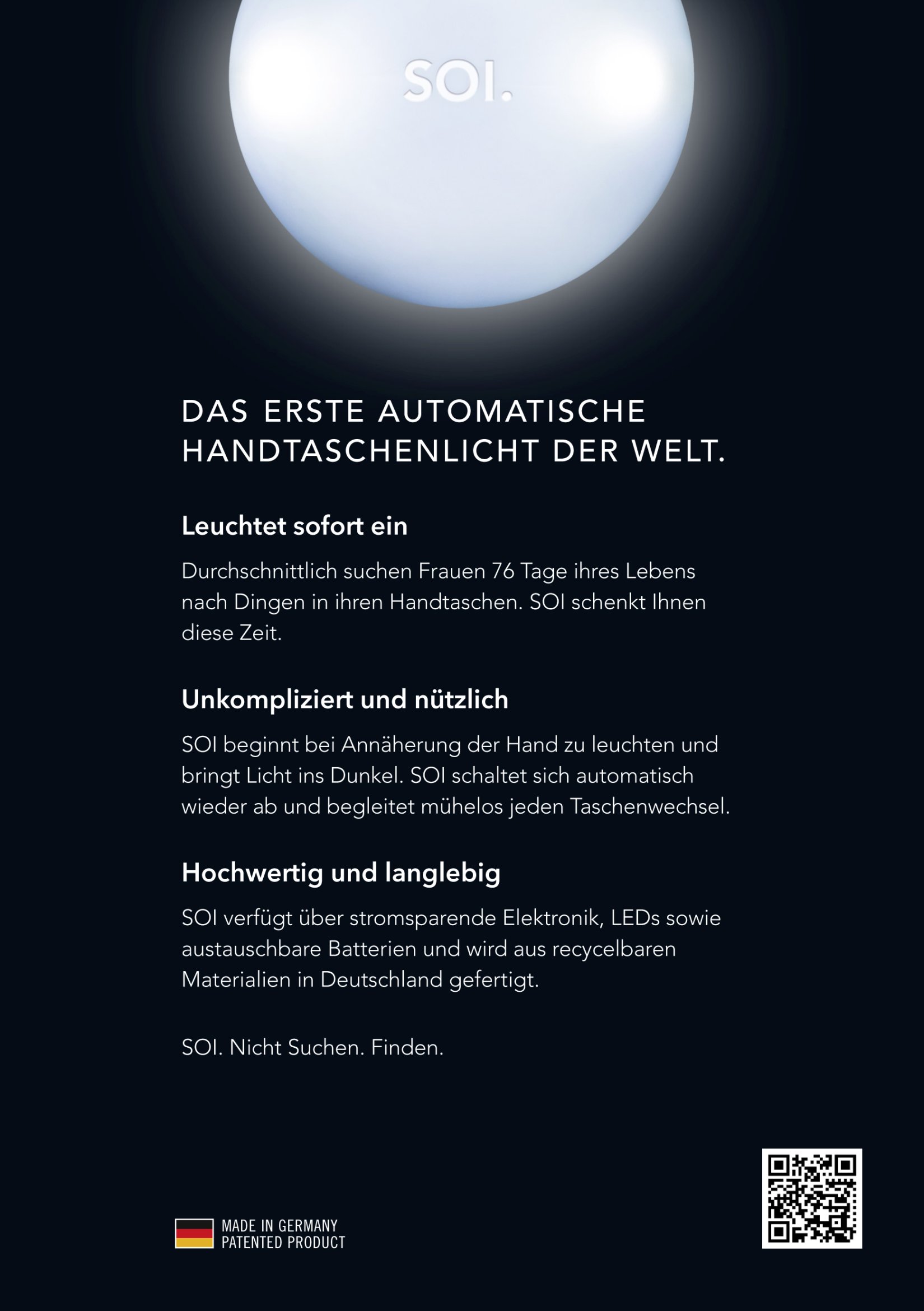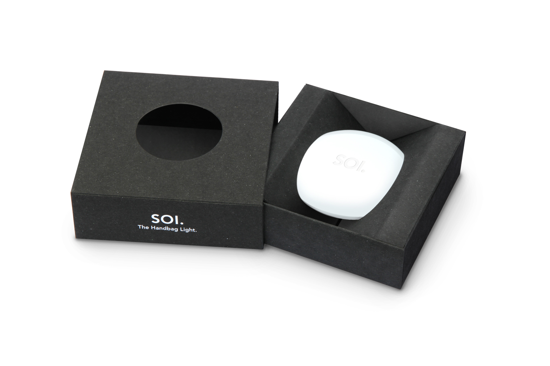 SOI ist das erste automatische Handtaschenlicht der Welt. Ohne Schalter oder sonstige Unannehmlichkeiten bringt SOI Licht ins Dunkel Ihrer Handtasche, sobald Sie zu Suchen beginnen. Und erlischt wieder, wenn Sie fündig wurden.