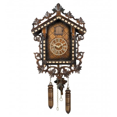 Holzgehäuse (Nussbaum gebeizt), 12 Melodien, Wasserfallgeräusch und Echo, autom. Nachtabschaltung per Lichtsensor, Quarzwerk.
