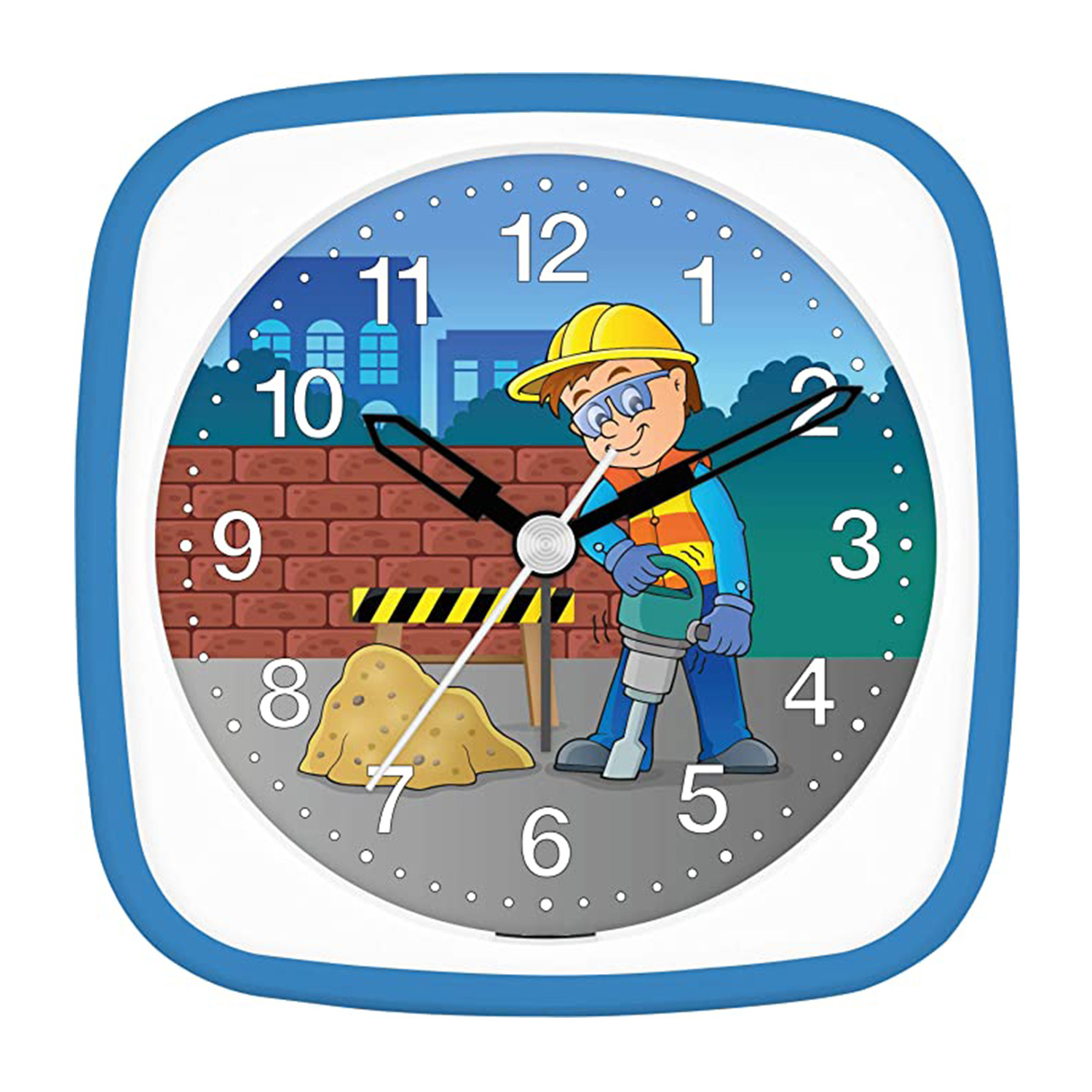 FÜR DIE KLEINSTEN BAUARBEITER: Der Bauarbeiter-Presslufthammer-Wecker besticht durch ein Zusammenspiel aus Motiv und Gehäuse. Die blaue Farbgebung des Motivhintergrunds spiegelt sich im Rahmen des Artikels prägnant wider.