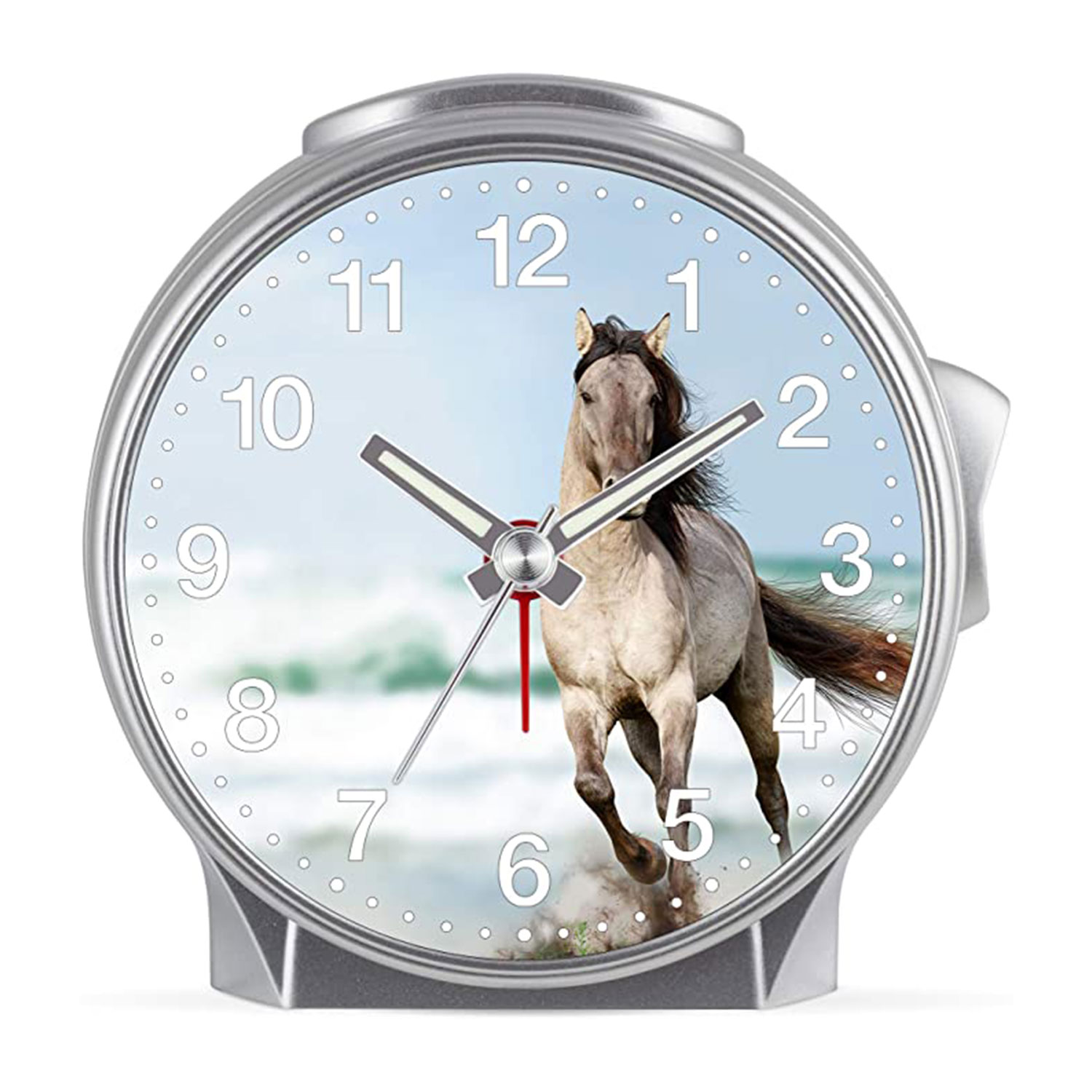 Das mit großen arabischen Ziffern versehene, von einem Pferde-Motiv geprägte Zifferblatt zeugt von einer kindgerechten Optik. Darüber hinaus verhindert eine schleichende Sekunde ein unliebsames Tick-Tack und ermöglicht den Kleinsten somit jederzeit einen ungestörten Schlaf. Ausgestattet ist der Kinderwecker mit einem zuverlässigen Quarzwerk.