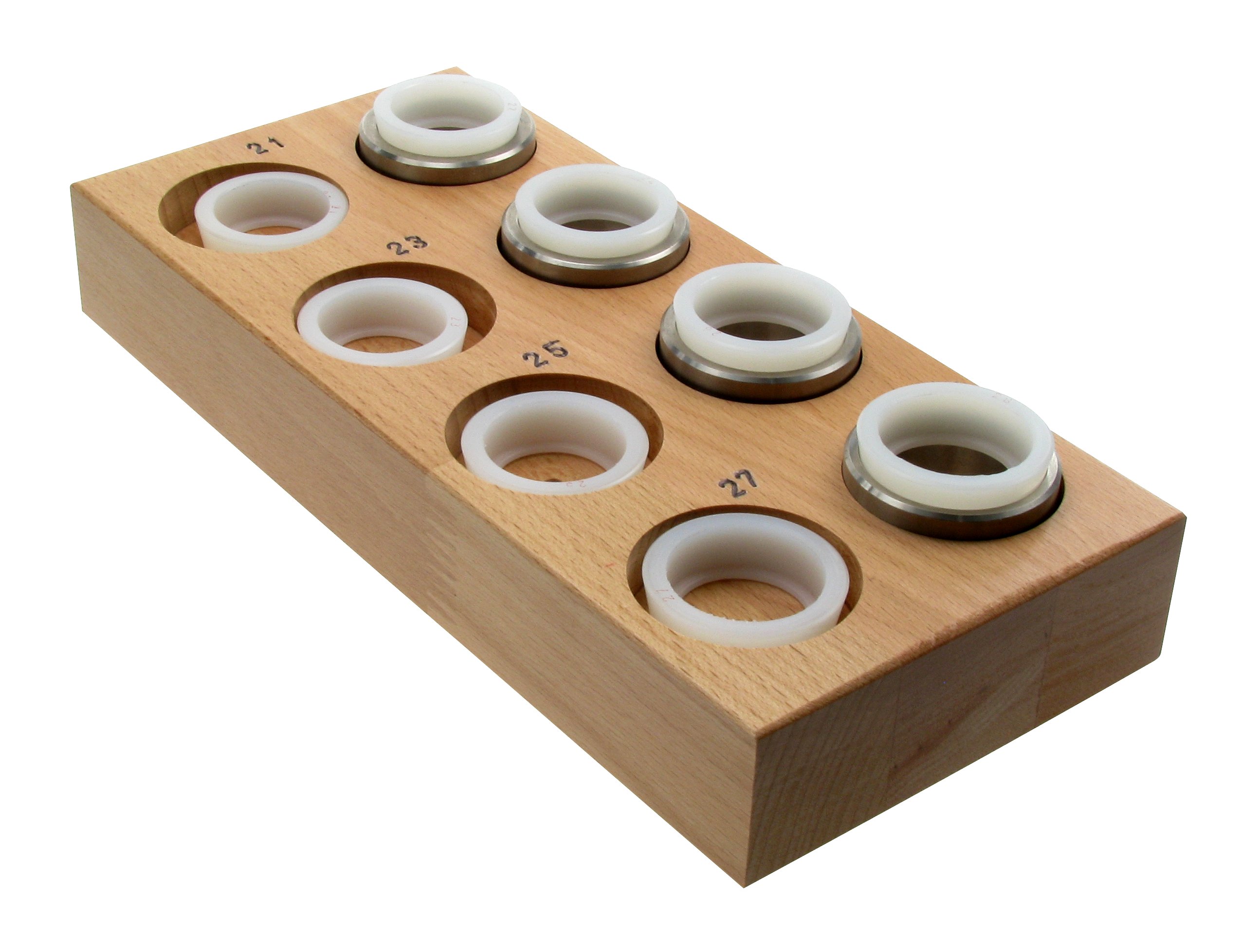 Für Kunststoffeinsätze. Die Distanzscheiben verhindern ein Schrägsetzen des Ringes. Nach dem Einlegen des Ringes in den passenden Kunststoffeinsatz wird der Einsatz bis zur Oberkante mit Distanzscheiben aufgefüllt. Mit Holzleiste zur Montage am Holzsockel von 4 450 006.