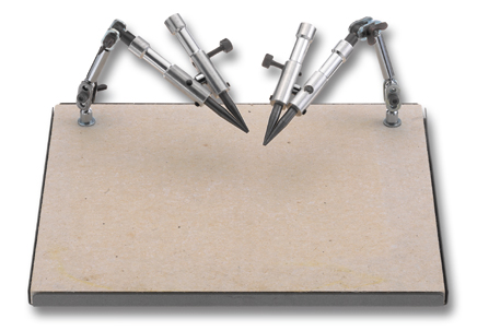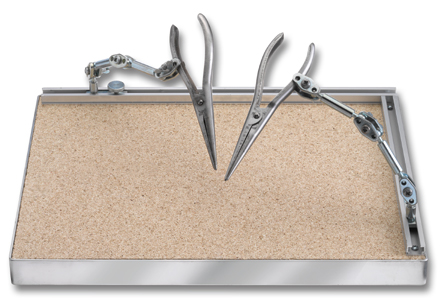 Ca. 150 x 150mm große Lötplatte, hitzebeständig, mit zwei Haltezangen in beweglichen Haltegelenken.
