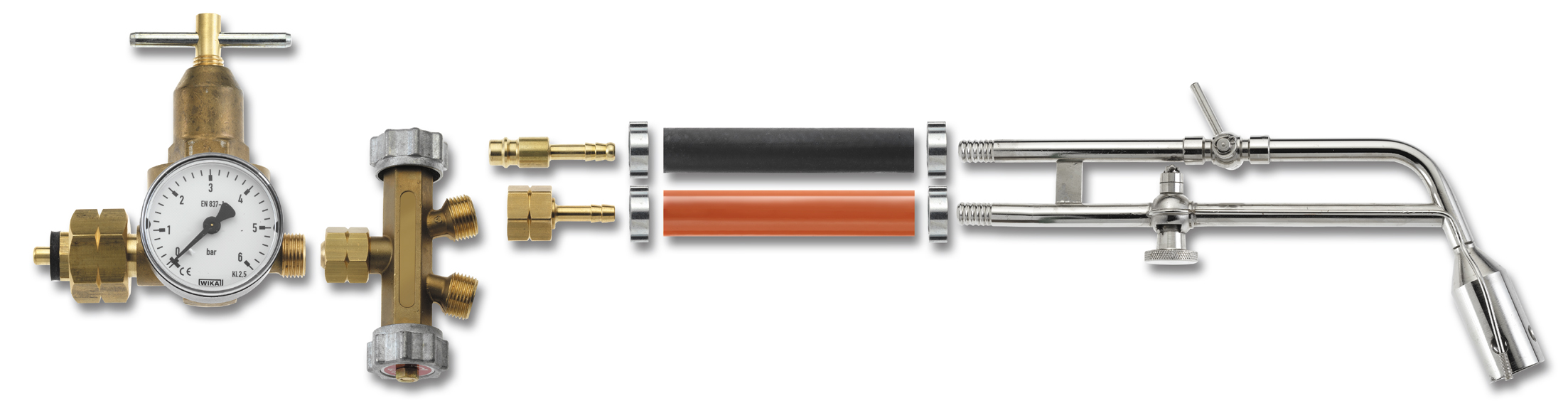 Alle Gasarten (außer Sauerstoff) verwendbar. Die Flammengröße wird mit einem Reiberhahn an der Gaszuführung eingstellt. Die Luftzuführung wird mit einem Hebelhahn reguliert. Damit ist es möglich, auch Lötarbeiten an größeren Teilen durchzuführen. Zum Schmelzen geeignet. Die Löt- und Schmelzpistole darf nur in Verbindung mit einem Druckluftkompressor betrieben werden.