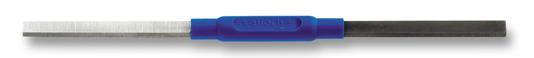 Aus Widia-Stahl, mit 2 Schliff-Flächen, je 1 Kante für Rad- und Unruhzapfen. Metallheft mit Schutzkappe.