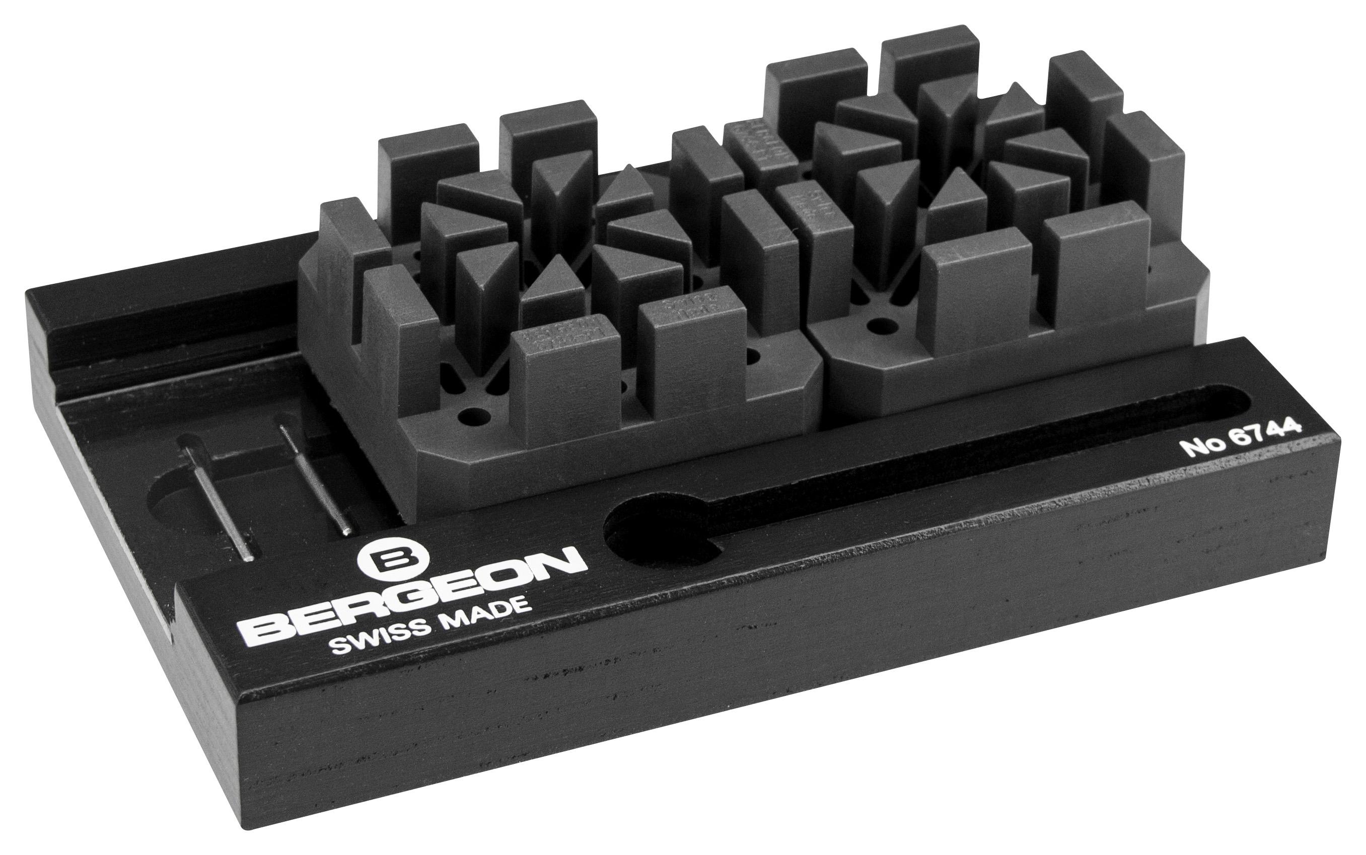 Zwei Kunststoffsockel, die Uhren mit Metallarmbändern gleichzeitig auf der rechten und linken Seite in der gewünschten Position halten, um die Bandstifte ein- oder auszuschlagen. Die Kunststoffsockel mit breiten Schlitzen für dicke Bänder sind mit Bohrungen zum Auffangen der ausgeschlagenen Stifte ausgestattet.