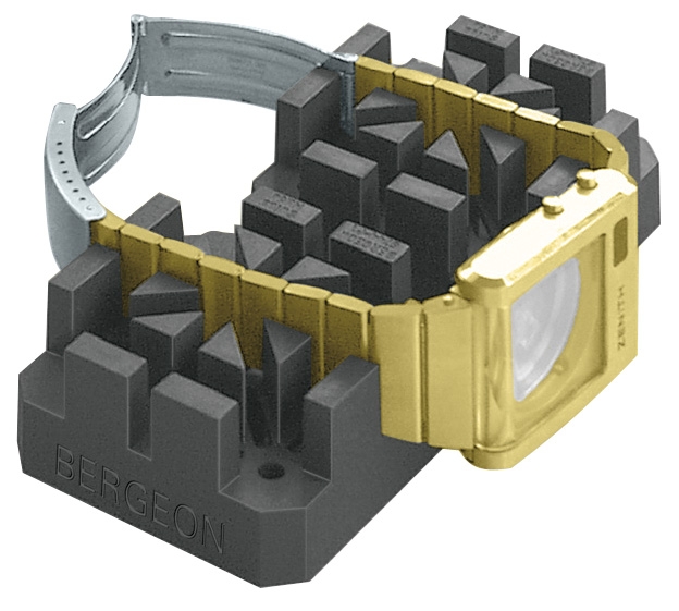 Zwei Kunststoffsockel, die Uhren mit Metallarmbändern gleichzeitig auf der rechten und linken Seite in der gewünschten Position halten, um die Bandstifte ein- oder auszuschlagen. Die Kunststoffsockel mit breiten Schlitzen für dicke Bänder sind mit Bohrungen zum Auffangen der ausgeschlagenen Stifte ausgestattet.