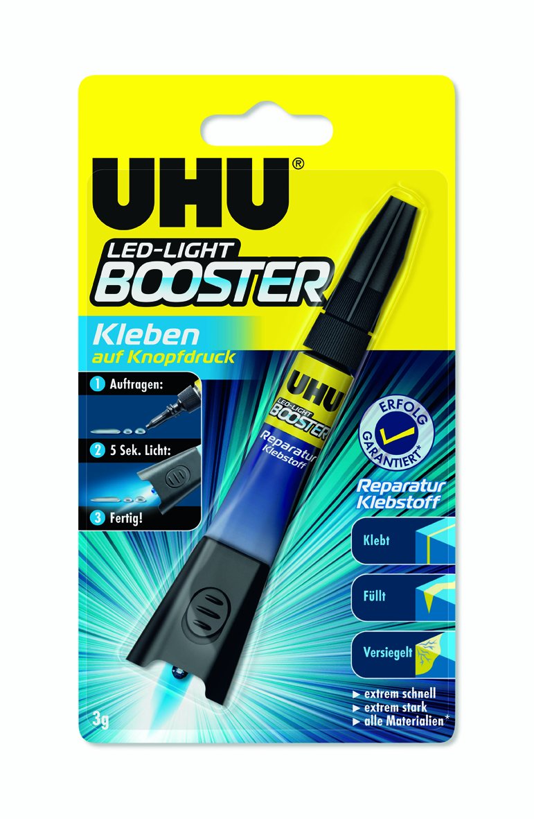 Der neue UHU LED-Light Booster ist ein extrem schneller und extrem starker Reparatur-Klebstoff, der mit Hilfe der speziellen LED-Lampe auf Knopfdruck klebt: Sobald die einzigartige Klebstoffformel mit dem blauen Licht der LED-Lampe aktiviert wird, härtet sie binnen weniger Sekunden komplett aus. UHU BOOSTER klebt, füllt und versiegelt Materialien aller Art. Im Vergleich zu herkömmlichen Sekundenklebern zeichnet sich der Klebstoff durch exzellente Füll-Eigenschaften aus, sodass die Klebeflächen nicht deckungsgleich sein müssen.