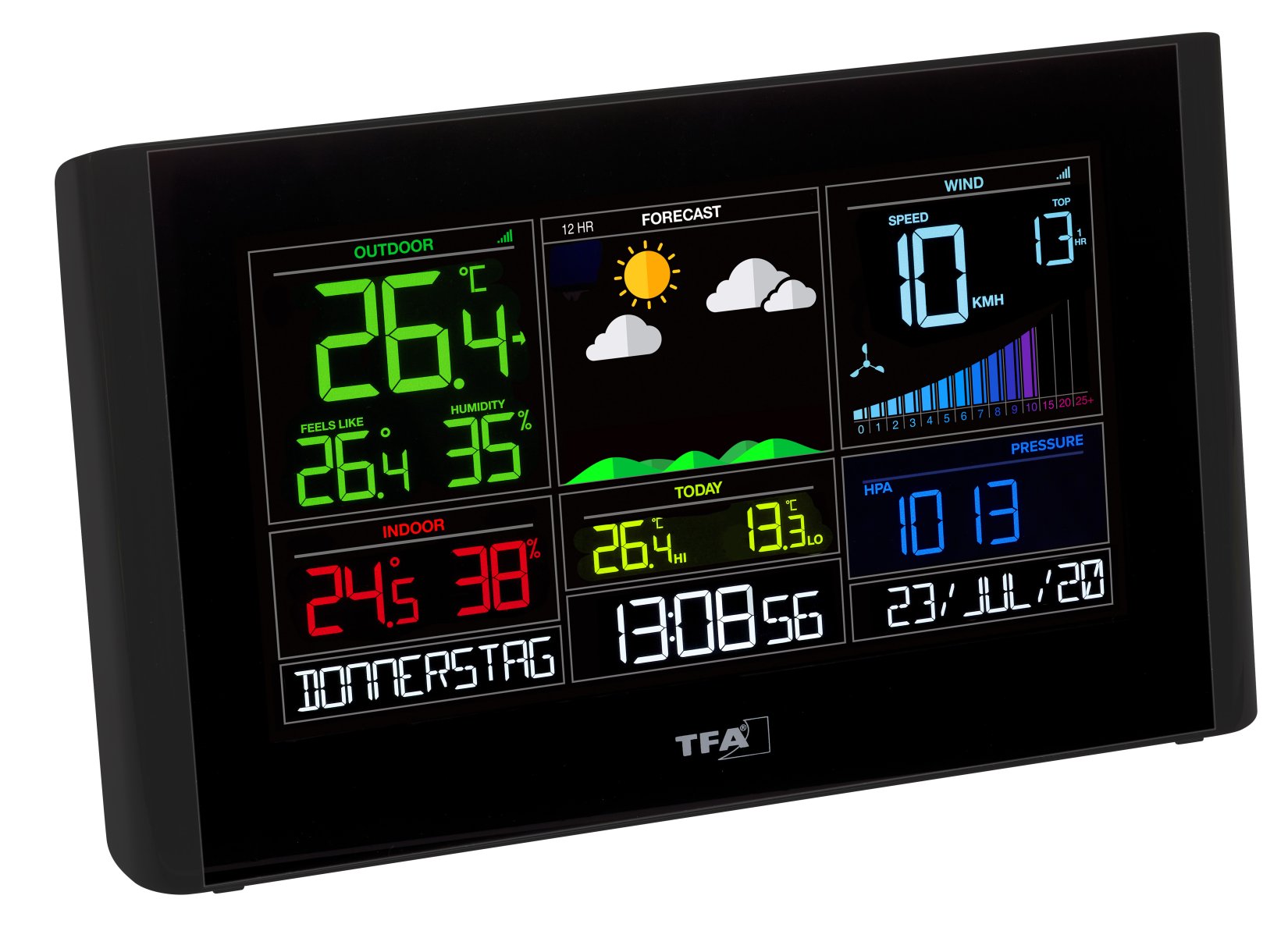 Bis zu 4 weitere Sender, z.B. zur Temperatur- und Luftfeuchtigkeitskontrolle im Kinderzimmer oder ein Poolsender, können auf der Station angezeigt werden. Das kontrastreiche Farbdisplay lässt sich in drei Helligkeitsstufen regulieren und bei Nacht automatisch dimmen.
