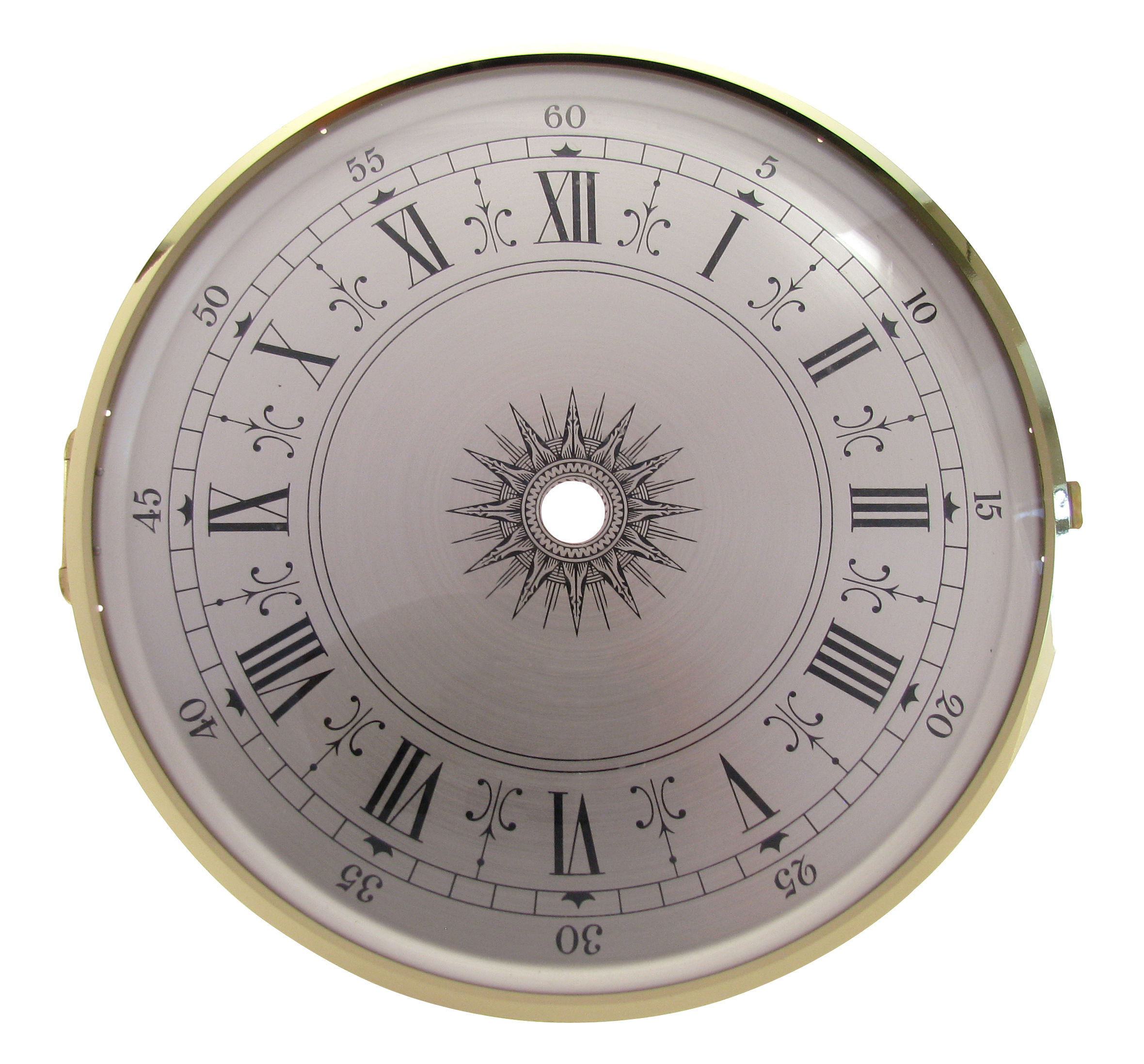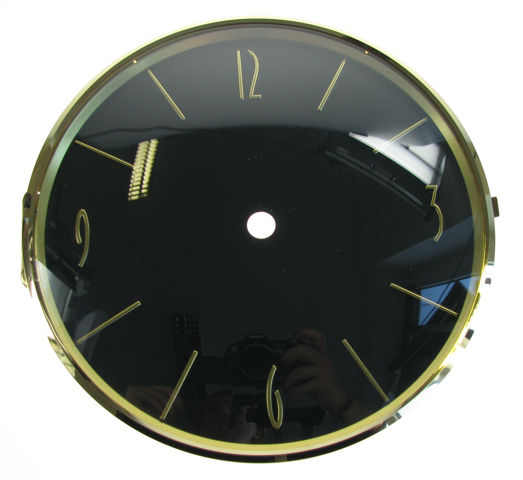 Polished, brass-colored aluminum with printed champagne-colored dial, recessed numerals. Domed hinged glass lid with diamond cut brass ring.