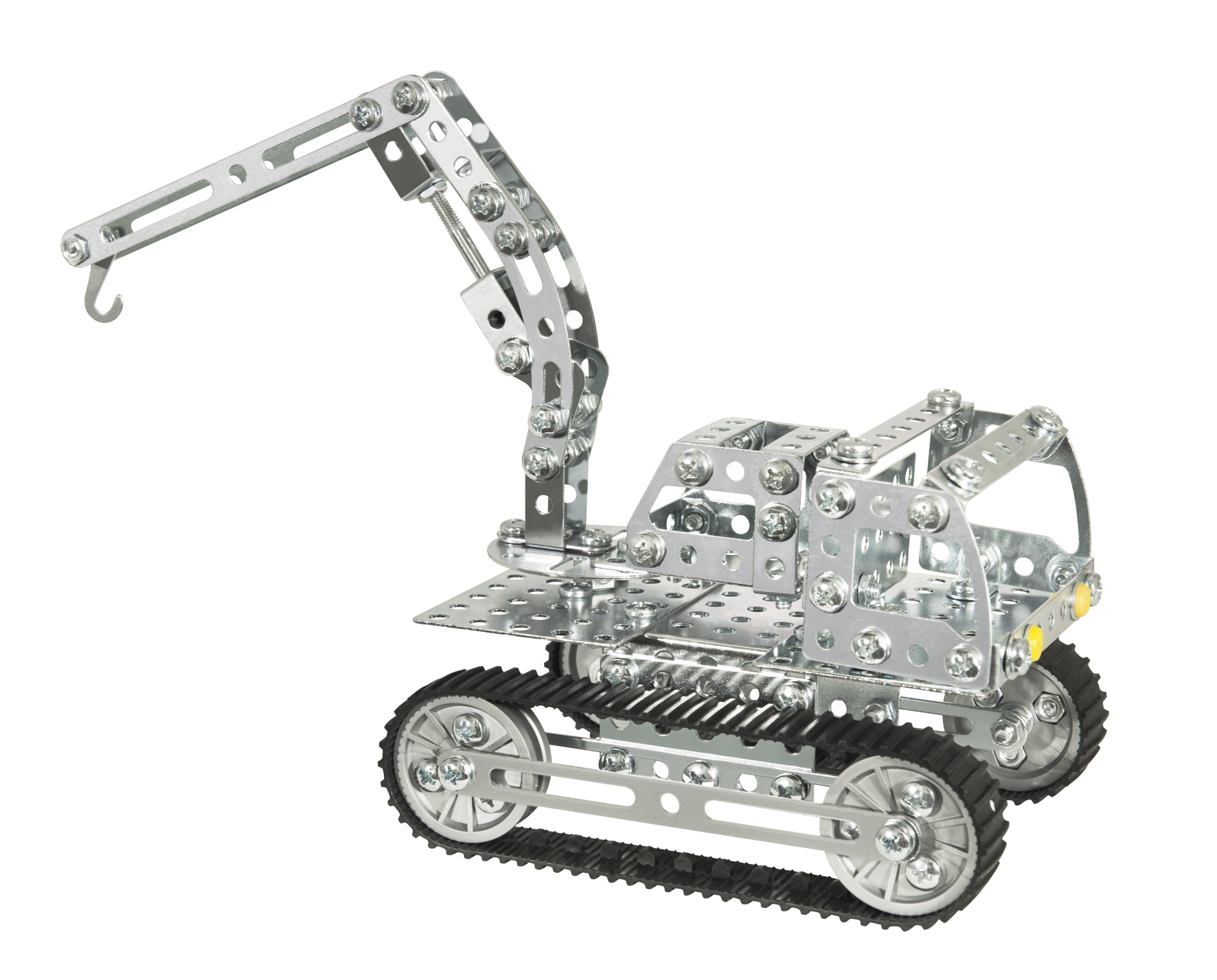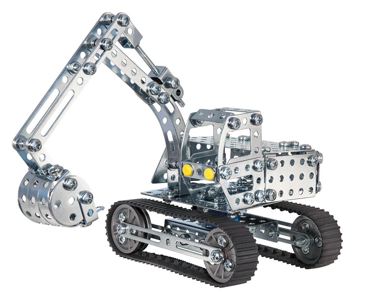 At least three different models can be built from over 340 parts. The excavator arm and shovel can be moved, and the rubber treadmills ensure that they roll quietly.