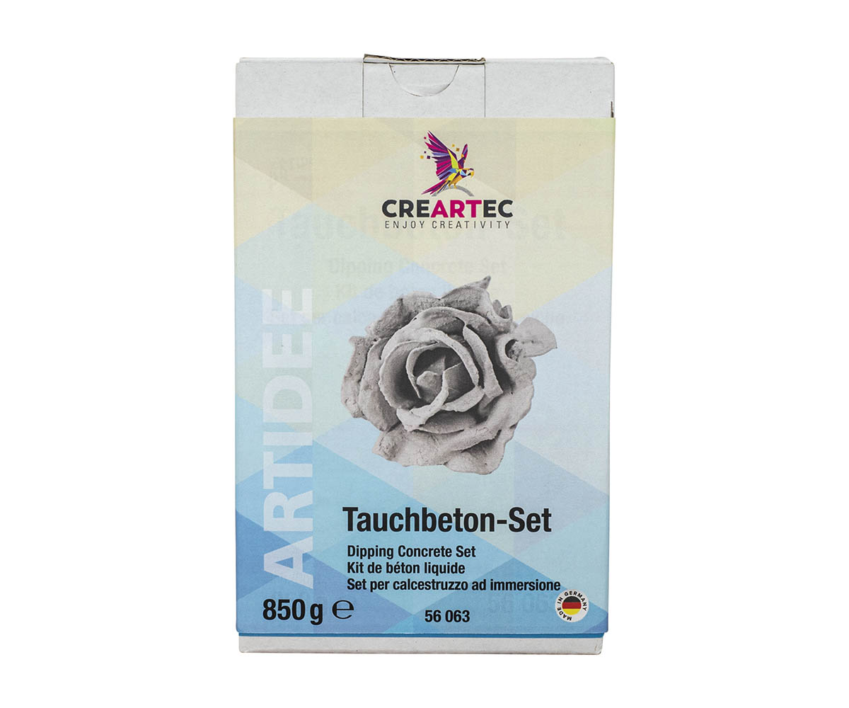 Important: Non-absorbent dip objects (flowers, e. g., roses and dahlias with sturdy blooms, as well as flowers made of plastic, parts made of styrofoam, plastic, wood etc.) must first be pretreated (dipped or painted) with adhesive medium (order no. 339942 or 339943) so that the adhesive layer firmly bonds to the concrete dip after drying. Absorbent textiles made of wool, linen, etc. can be dipped directly.