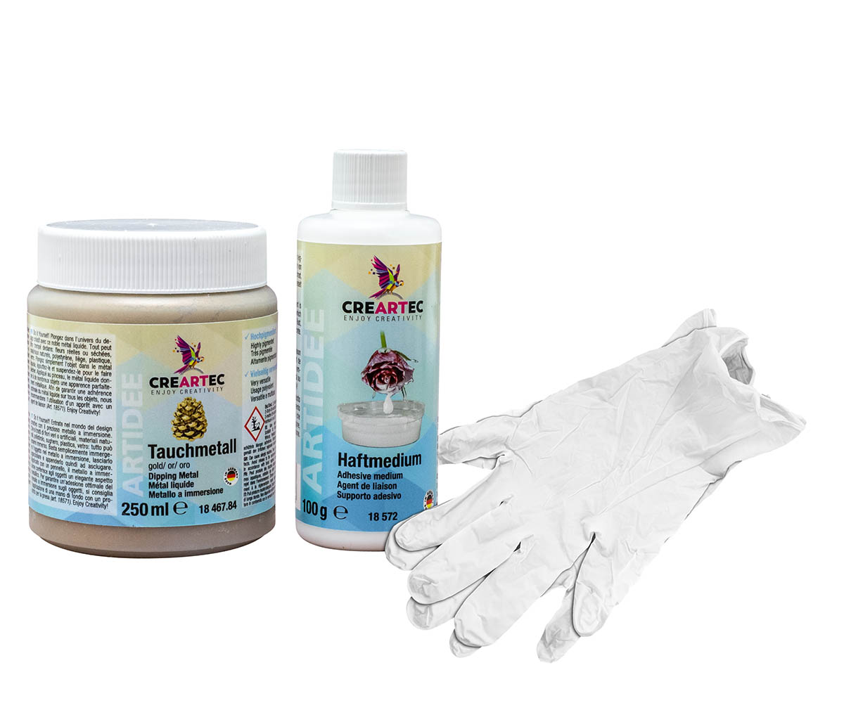 The immersed objects can be pretreated (immersed or painted with a brush) with adhesive medium (order no. 339942/339943) so that the metal dip adheres firmly during further processing. Absorbent fabrics may be first impregnated with fabric stiffener (order no. 339947) and, after drying and hardening, immersed into the metal dip so that it adheres firmly. The metal dip dries on firmly within 40 - 60 minutes and immediately shows its metallic appearance.