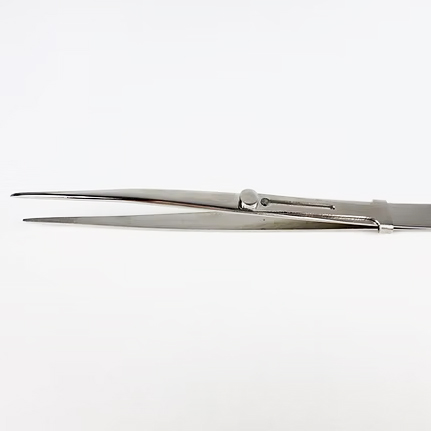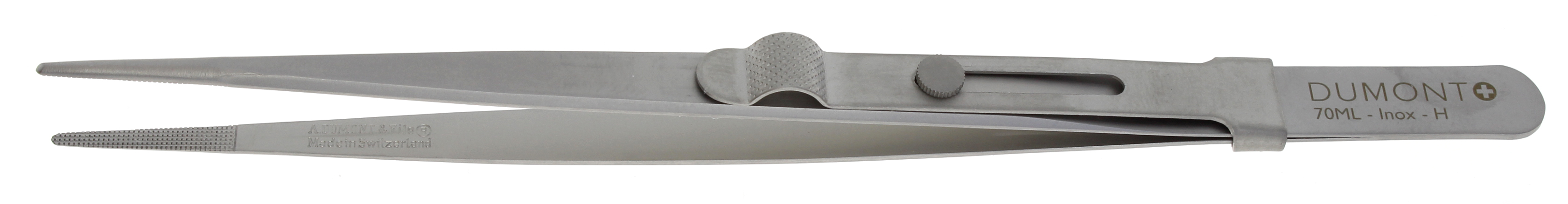 Stainless Steel, Swiss quality. With wide, rounded tips (width 1.5 mm), serrated in the crosscut. With slider for clamping.