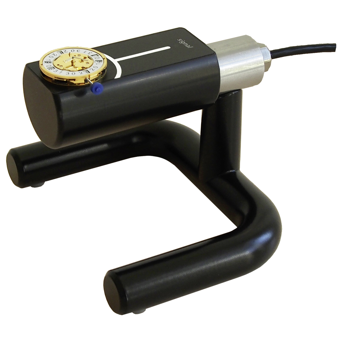 Der Mikrofon-Niederhalter hält auf dem Mikrofon Micromat C alle grossen und schweren Uhren sicher in jeder Prüflage. Der Niederhalter hält Uhren bis zu einem Gewicht von 500 Gramm. Damit das Prüfmaterial in keiner Weise beschädigt wird, berührt der neue Niederhalter die Uhr sanft mit einer weichen Silikonkappe.