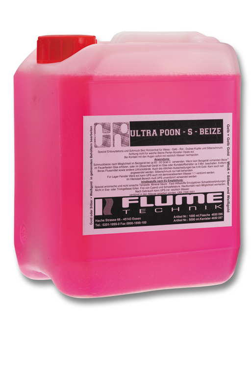 Gebrauchsfertiges Beizmittel zum Entfernen von Oxidationen sowie Flußmittelresten an Lötstellen auf allen Bunt- und Edelmetallen. Bei Gelbgoldlegierungen 333 entsteht beim Beizen keine rötlichen Abscheidungen. Ultra-Poon-S kann 1:1 mit Wasser verdünnt auch kalt als Entoxidationsmittel benutzt werden.